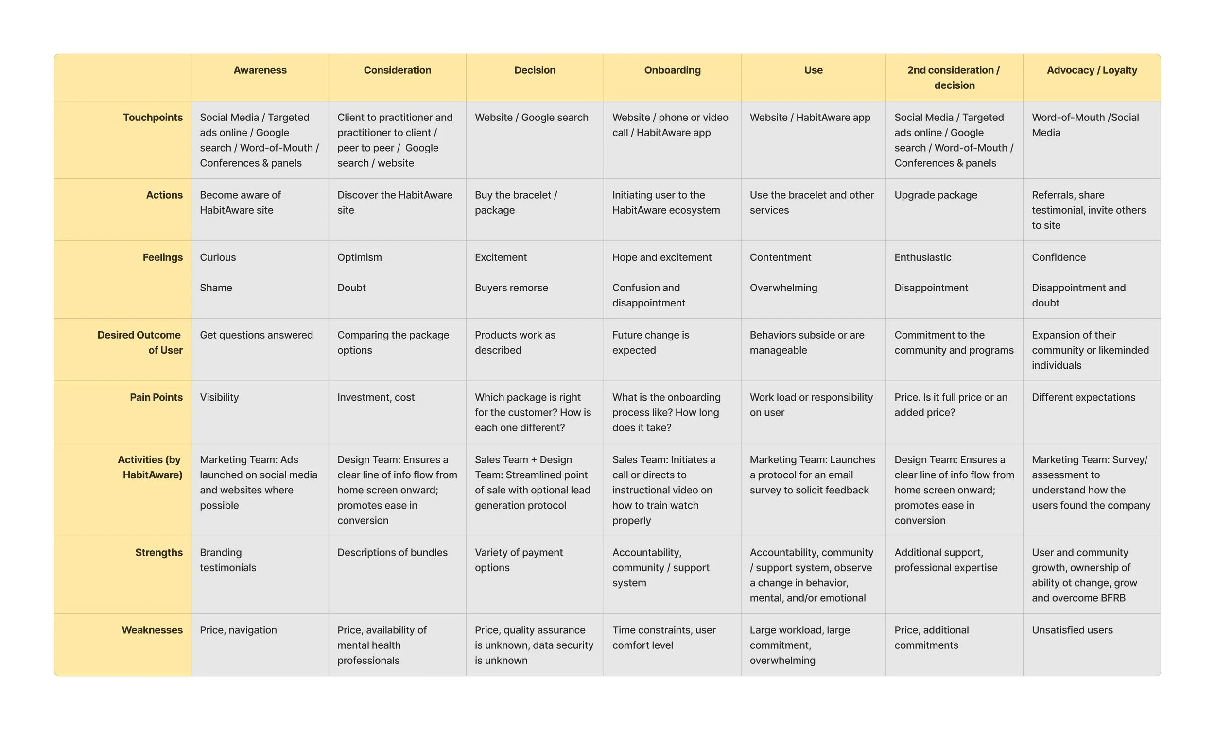 All user experience touch-points for HabitAware will help individuals who exhibit subconscious behaviors and wish to change these patterns as well as health professionals looking to assist patients with behavior modification to feel supported and/or empowered in their choices so that they are able to bring awareness to their subconscious behaviors through the use of a device, community-based support, and coaching. We will do this by focusing on a holistic treatment plan and how it is presented in critical touch-points. As a result, we hope to see a change in conversion and positive feedback